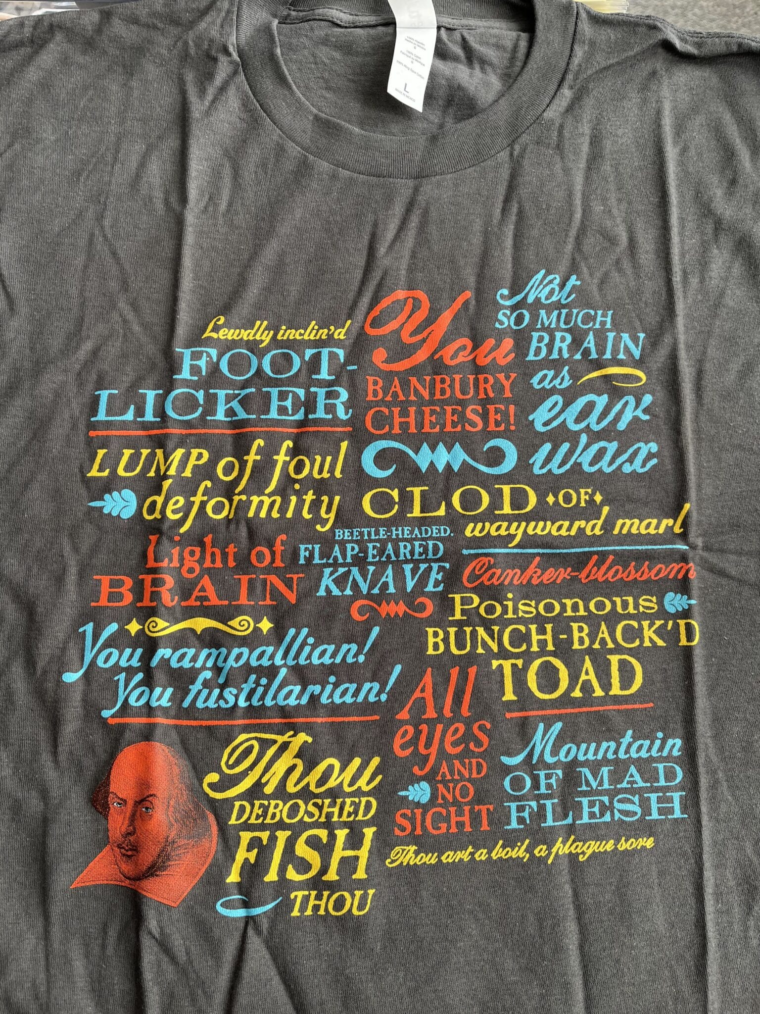 The "Shakespeare Insults" T-shirt features a witty design packed with the Bard’s sharpest jabs, perfect for fans of literary humor. This unique apparel combines classic literature with modern style for a clever wardrobe addition.